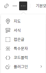 1. 글을 쓸 때 코드를 넣고 싶으면 상단 왼쪽에 있는 부분에서 ... 아이콘 클릭 후, < > 코드블럭 클릭