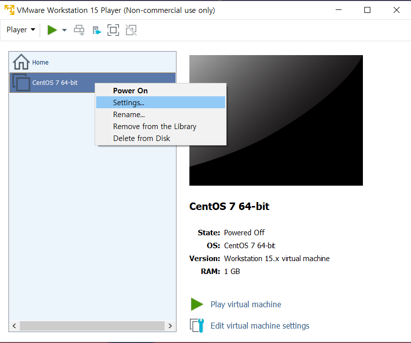 2. 본인이 설치한 CentOS 가상 머신 목록에서 [마우스 오른쪽] 클릭 -> [Settings...] 클릭