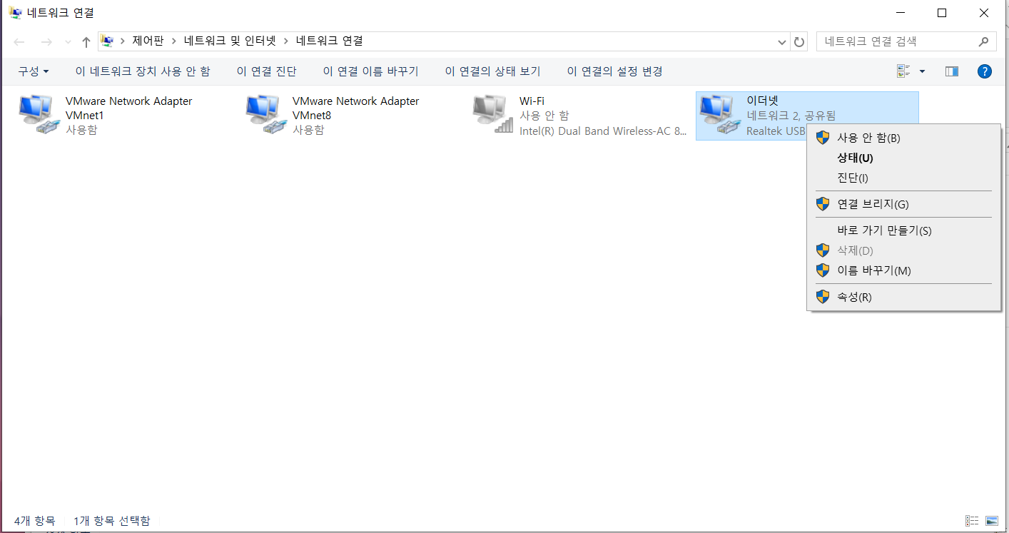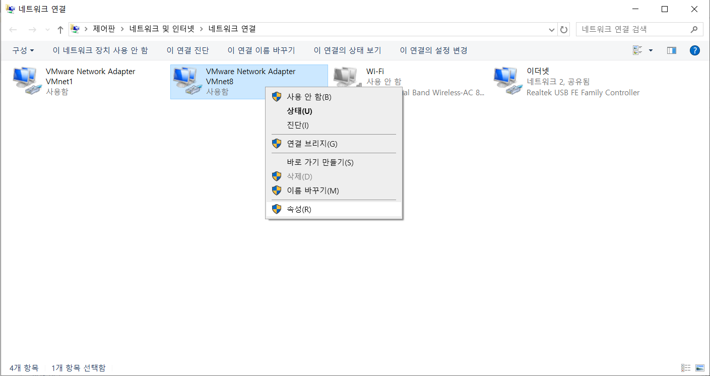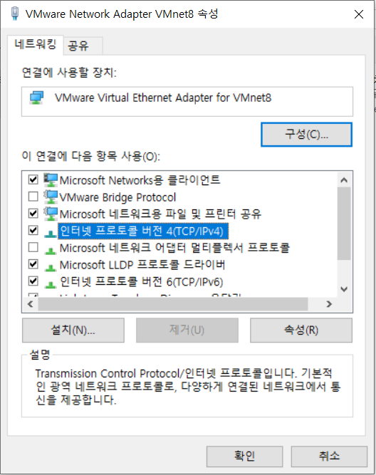 6. [VMware Network Adapter VMnet8] -> [마우스 오른쪽] 클릭 -> 속성