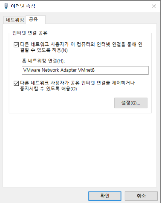 10. [공유] -> 체크박스 모두 체크 -> [VMnet8]로 설정 -> [확인]