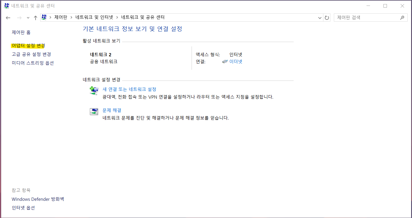 5. [제어판] -> [네트워크 및 인터넷] -> [네트워크 및 공유 센터] -> [어댑터 설정 변경]